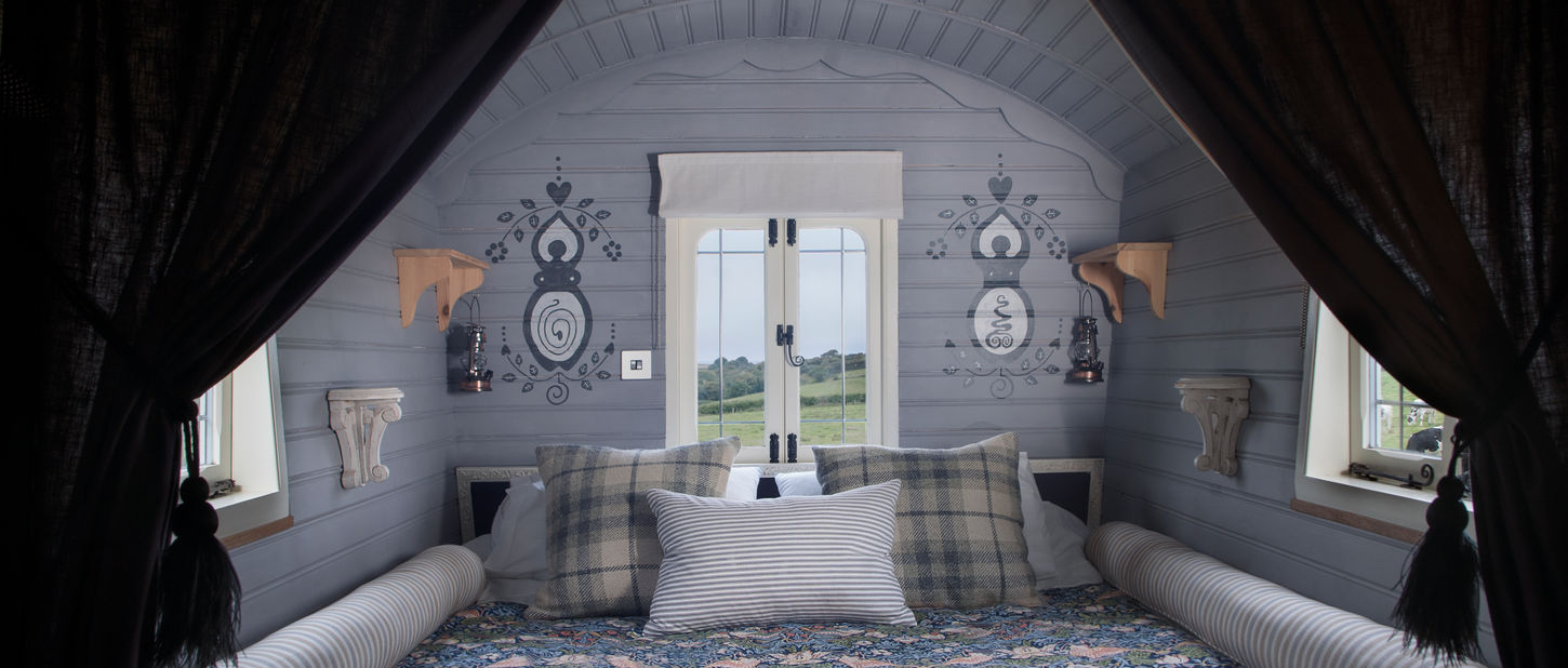 This enchanting luxury self-catering hideaway for two brings together a pair of showman’s wagons and a 17th-century underground bothy, all connected by a secret passageway. With your own private hot tub, a wildflower meadow, and a cast iron slipper bath that opens out onto sweeping countryside views.